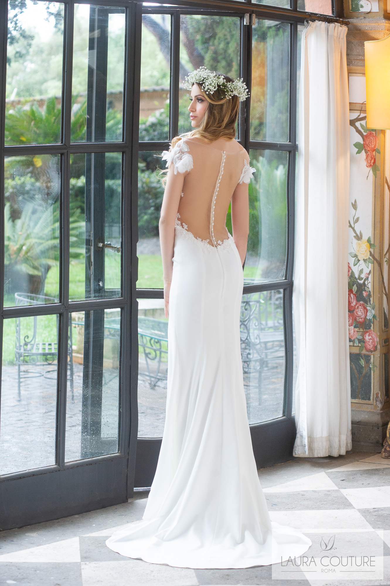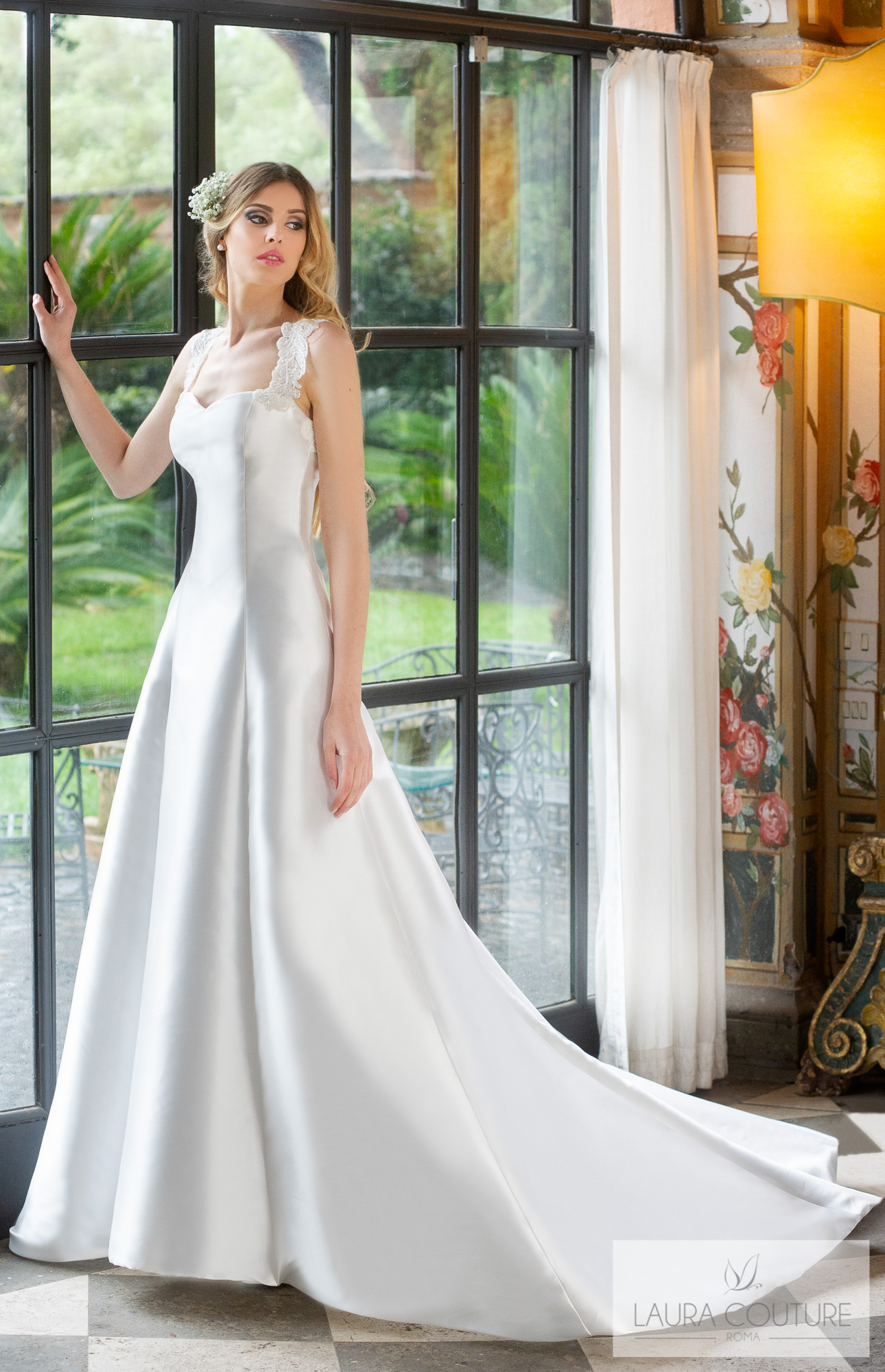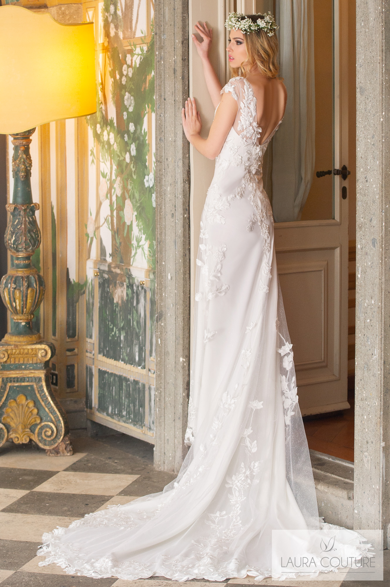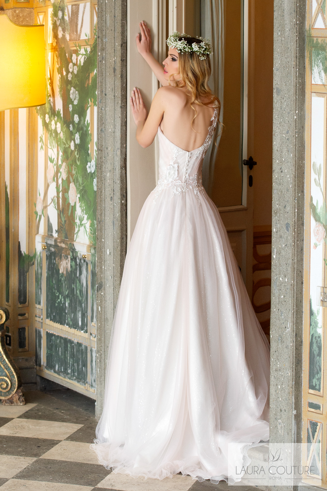 Abito in cadì e tulle glitter con ramage di pizzo macramè