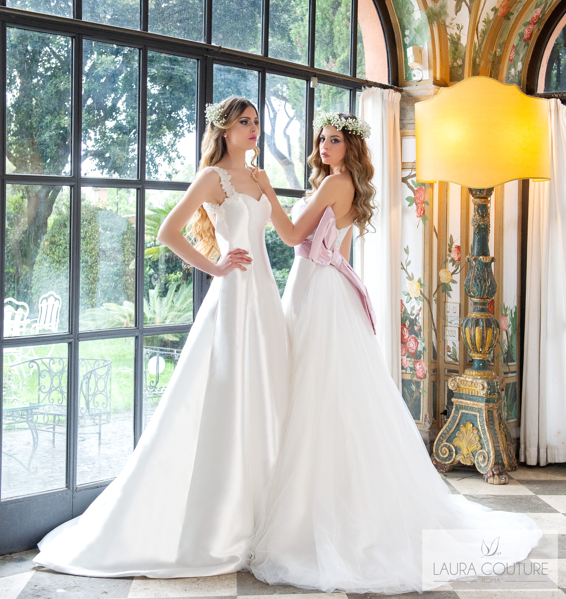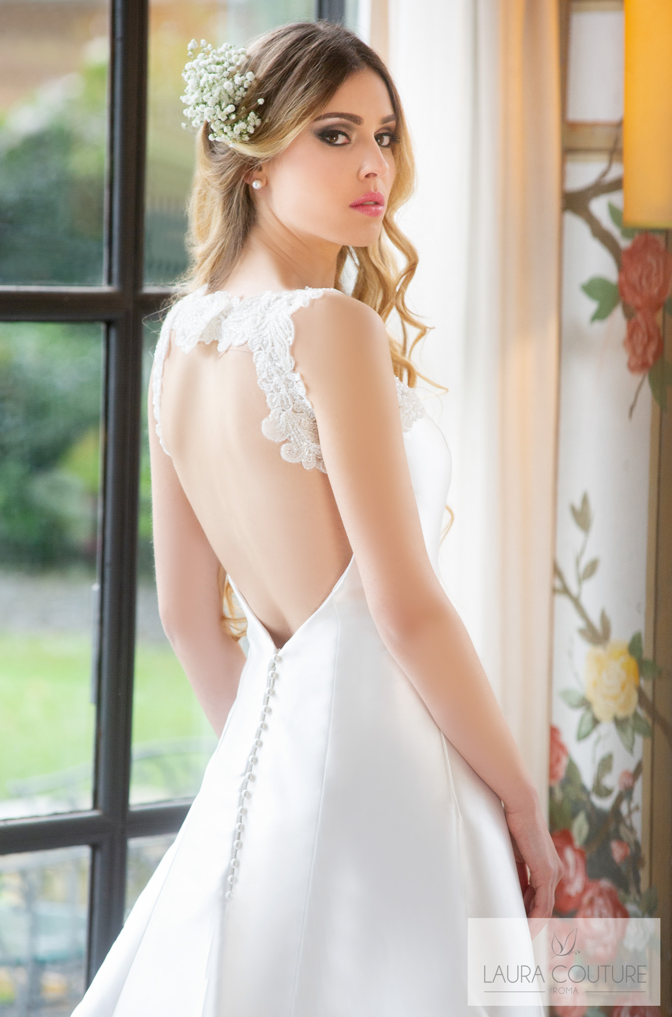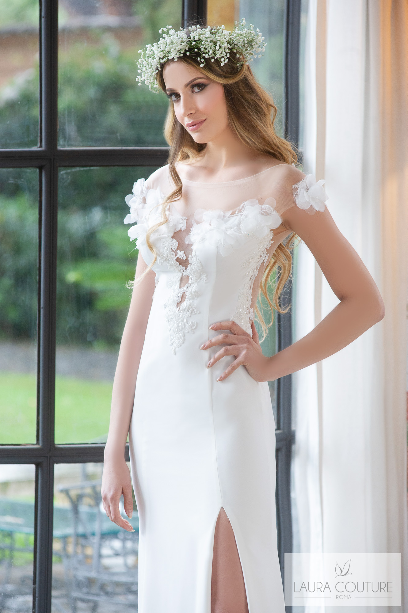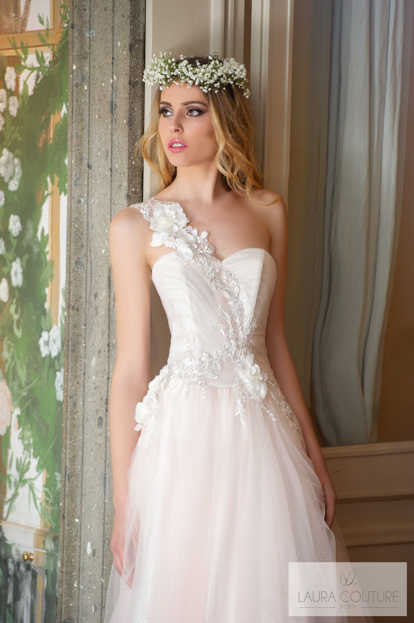 Abito in cadì e tulle glitter con ramage di pizzo macramè