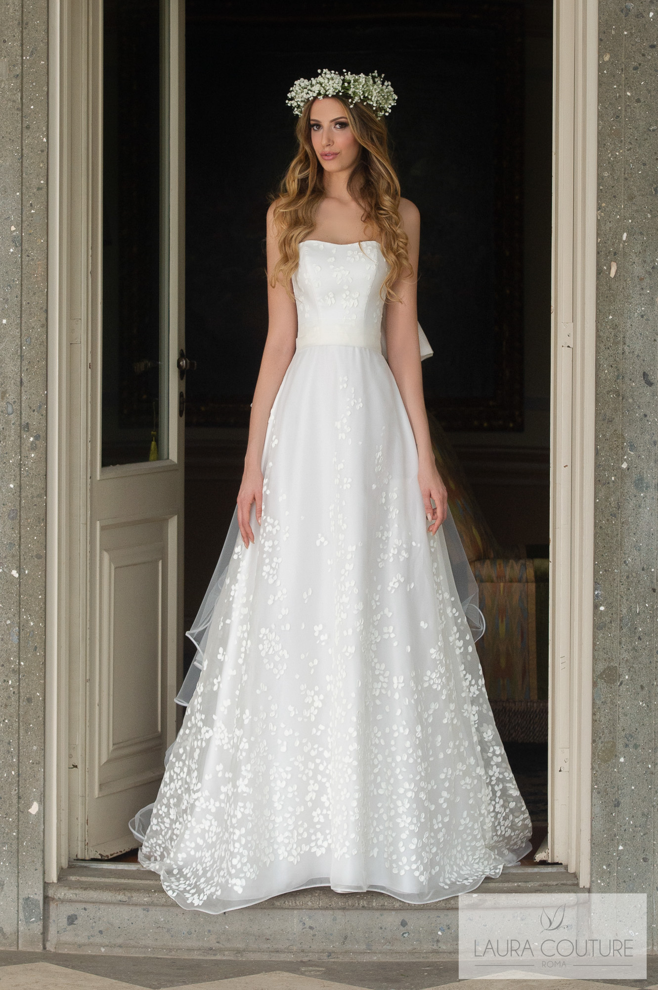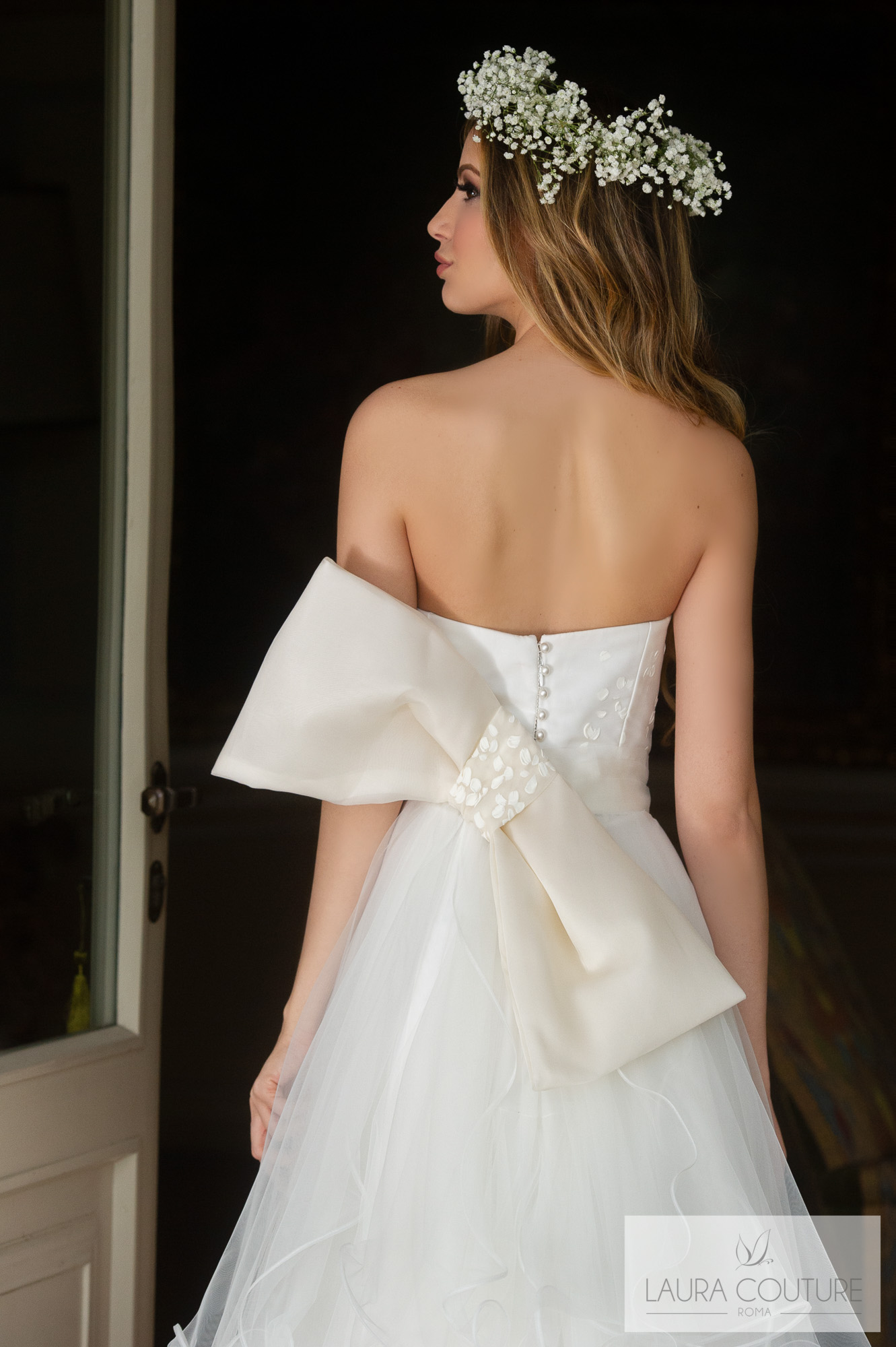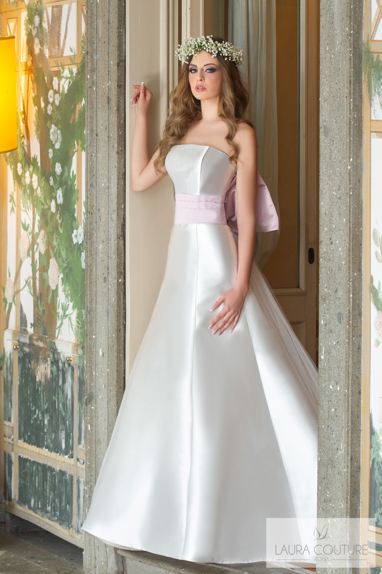 Abito in Mikado con fascia e fiocco in seta duchesse
