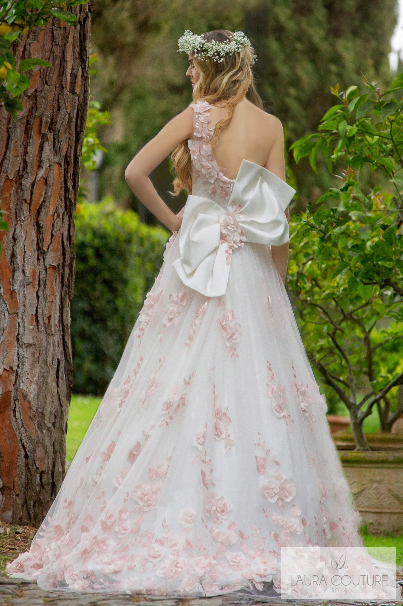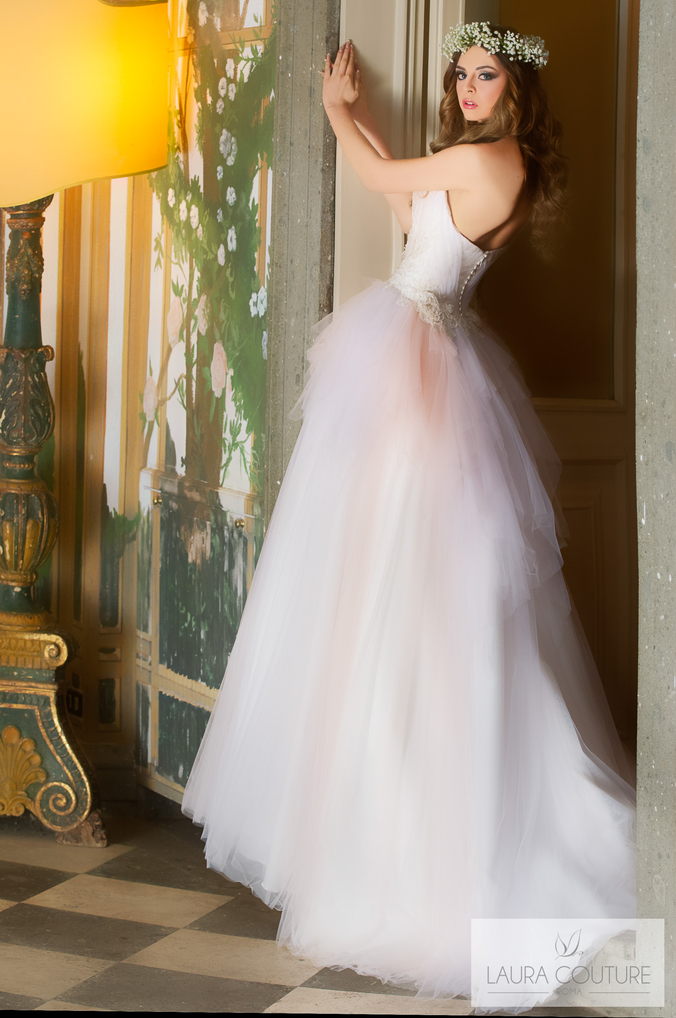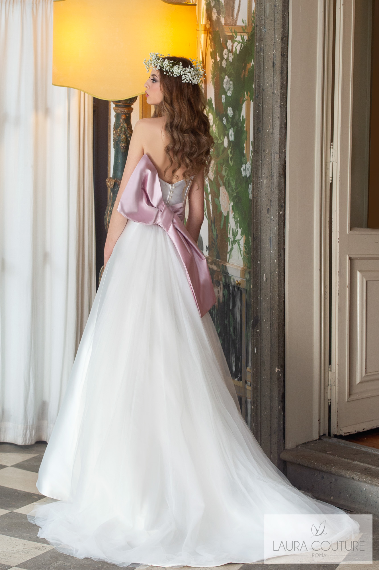 Abito in tulle mano seta sfumato dal color cipria al color glicine.