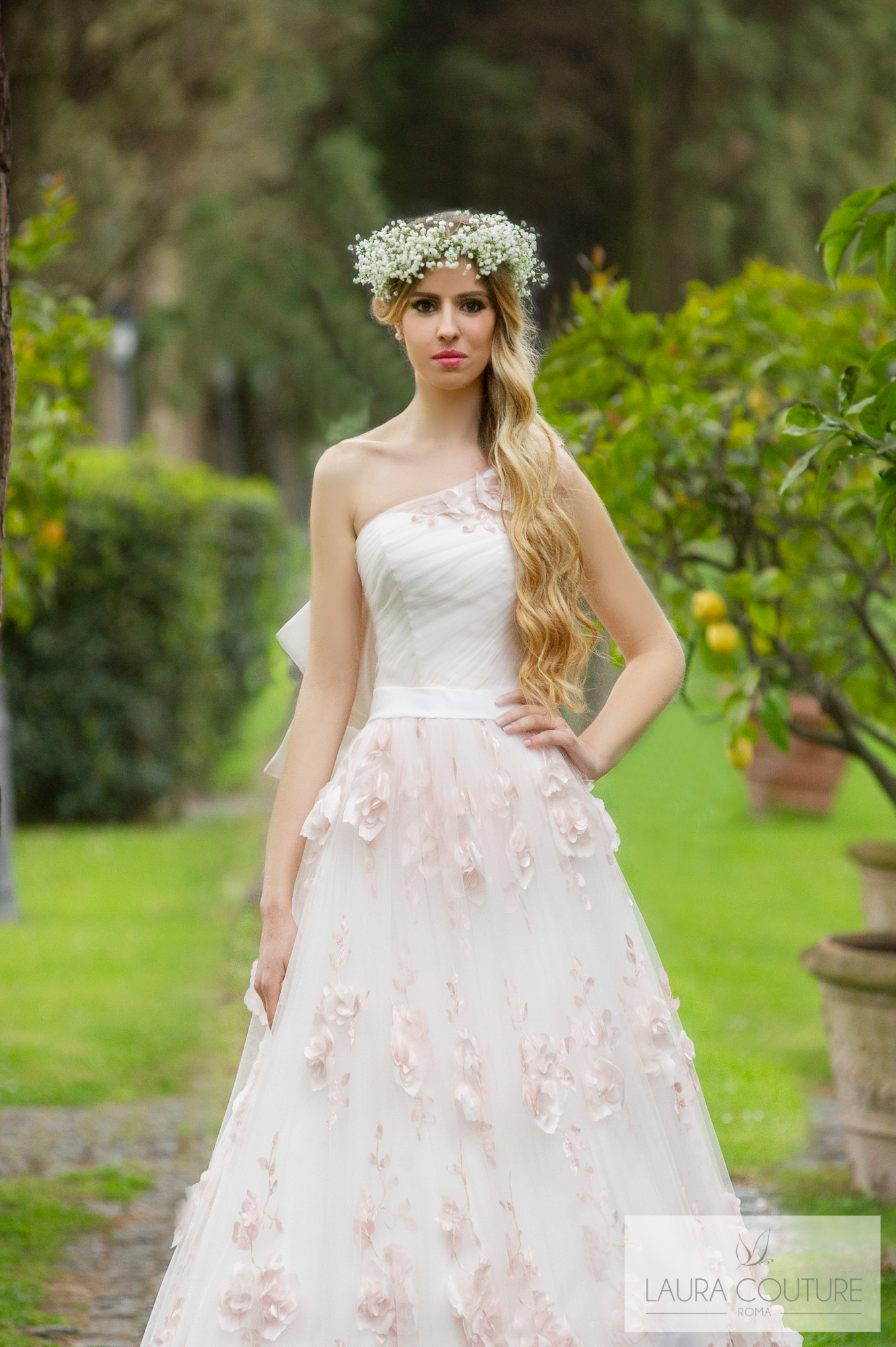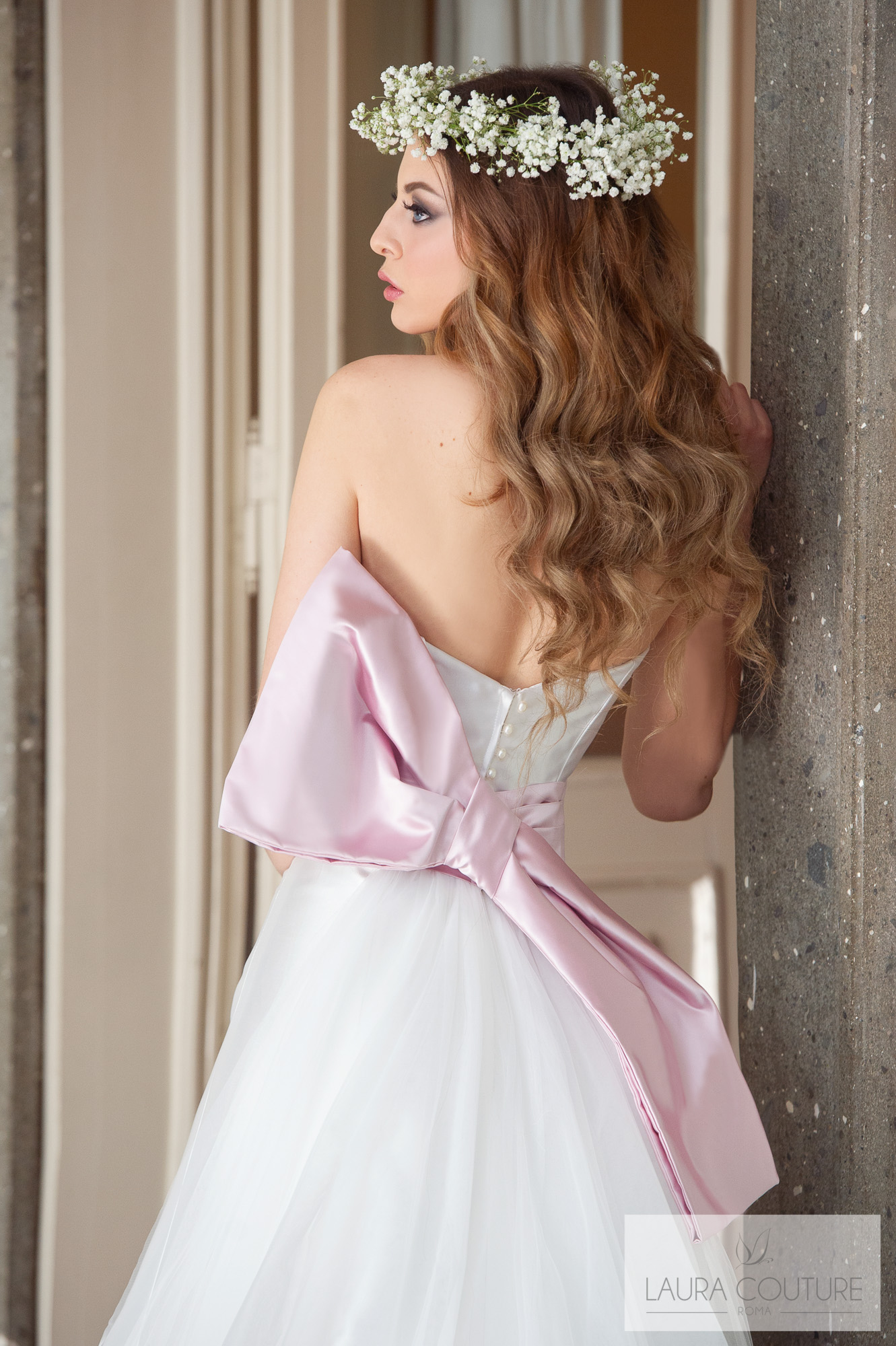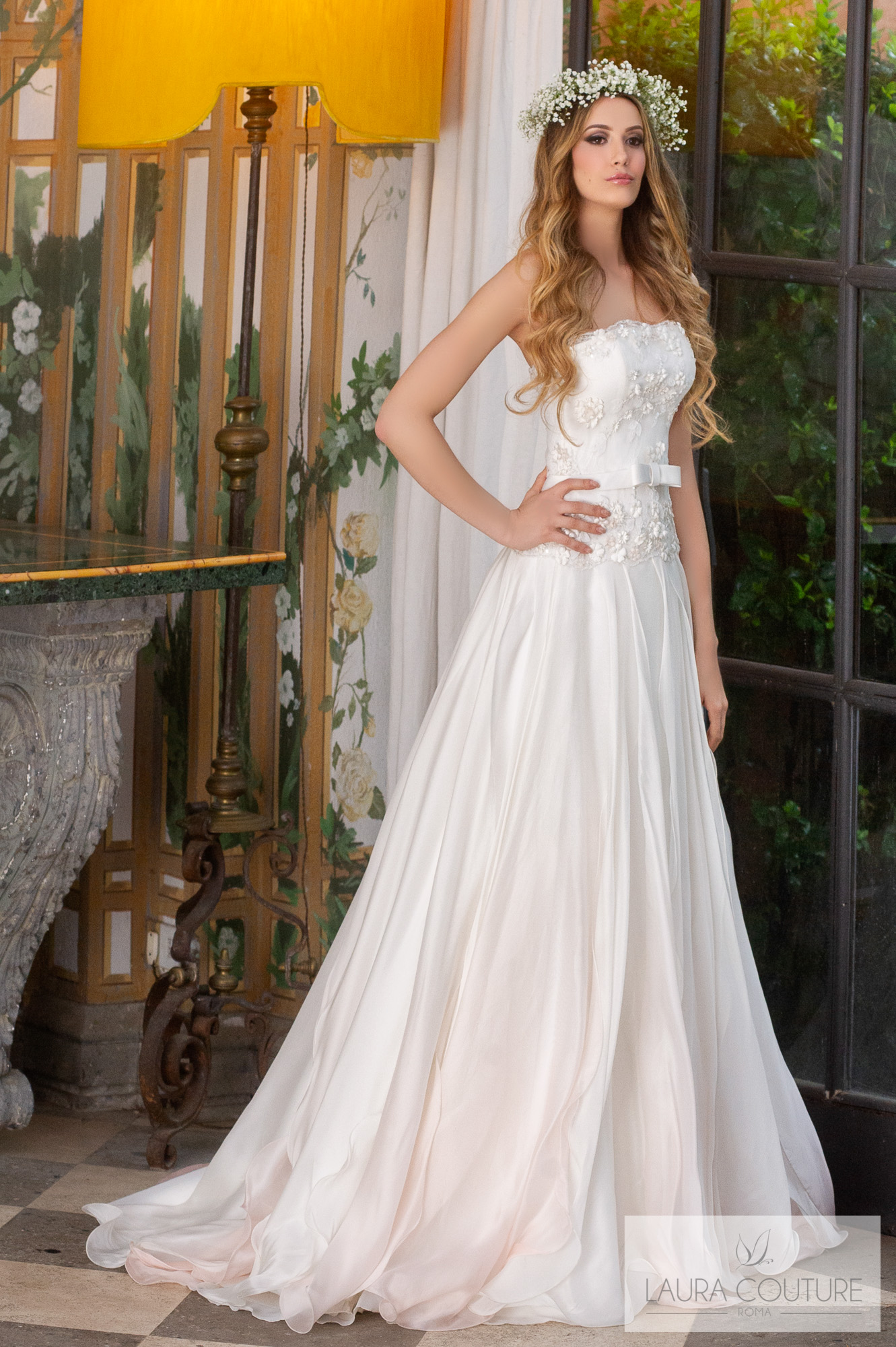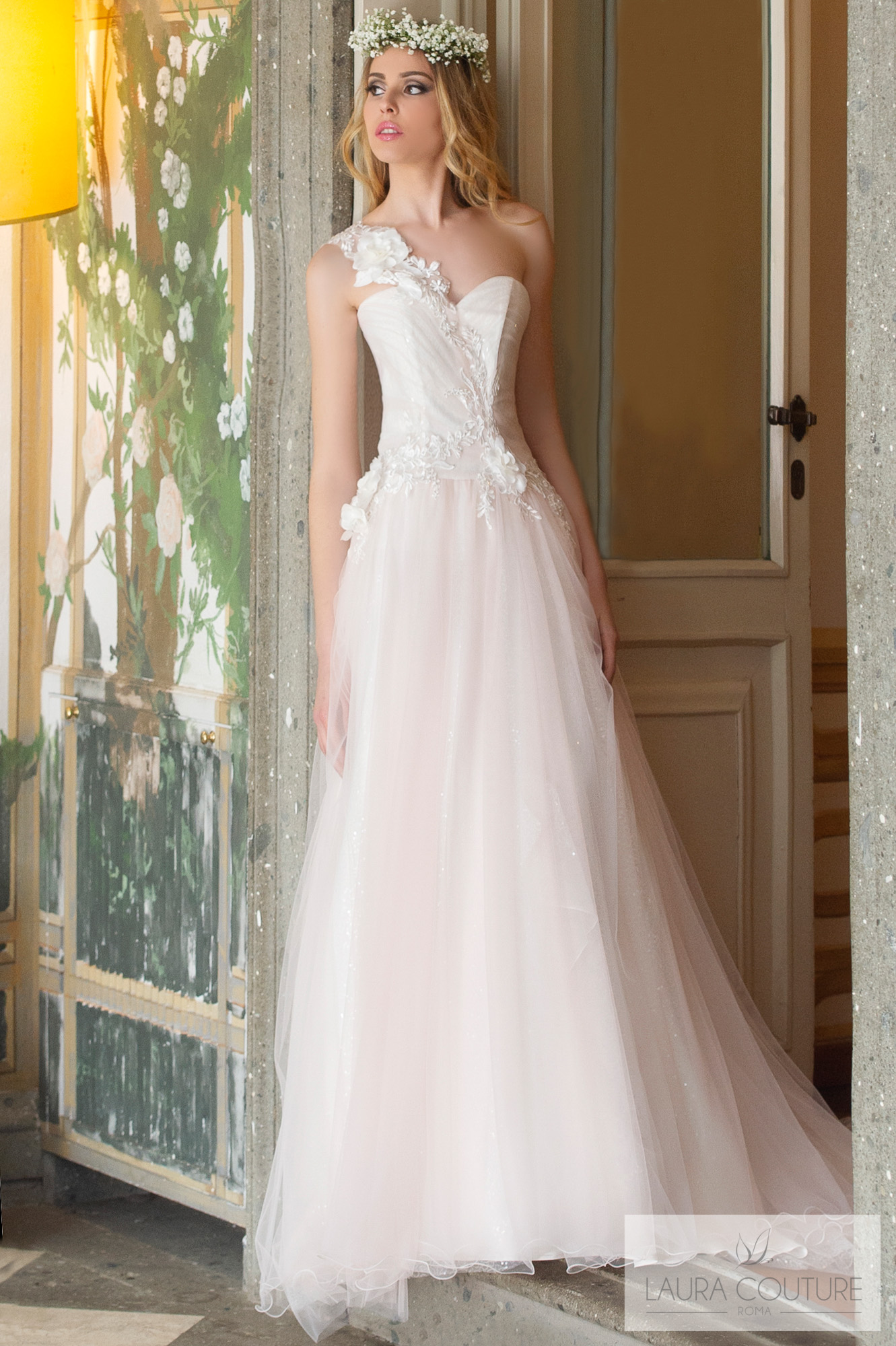 Abito in tulle mano seta sfumato dal color cipria al color glicine.