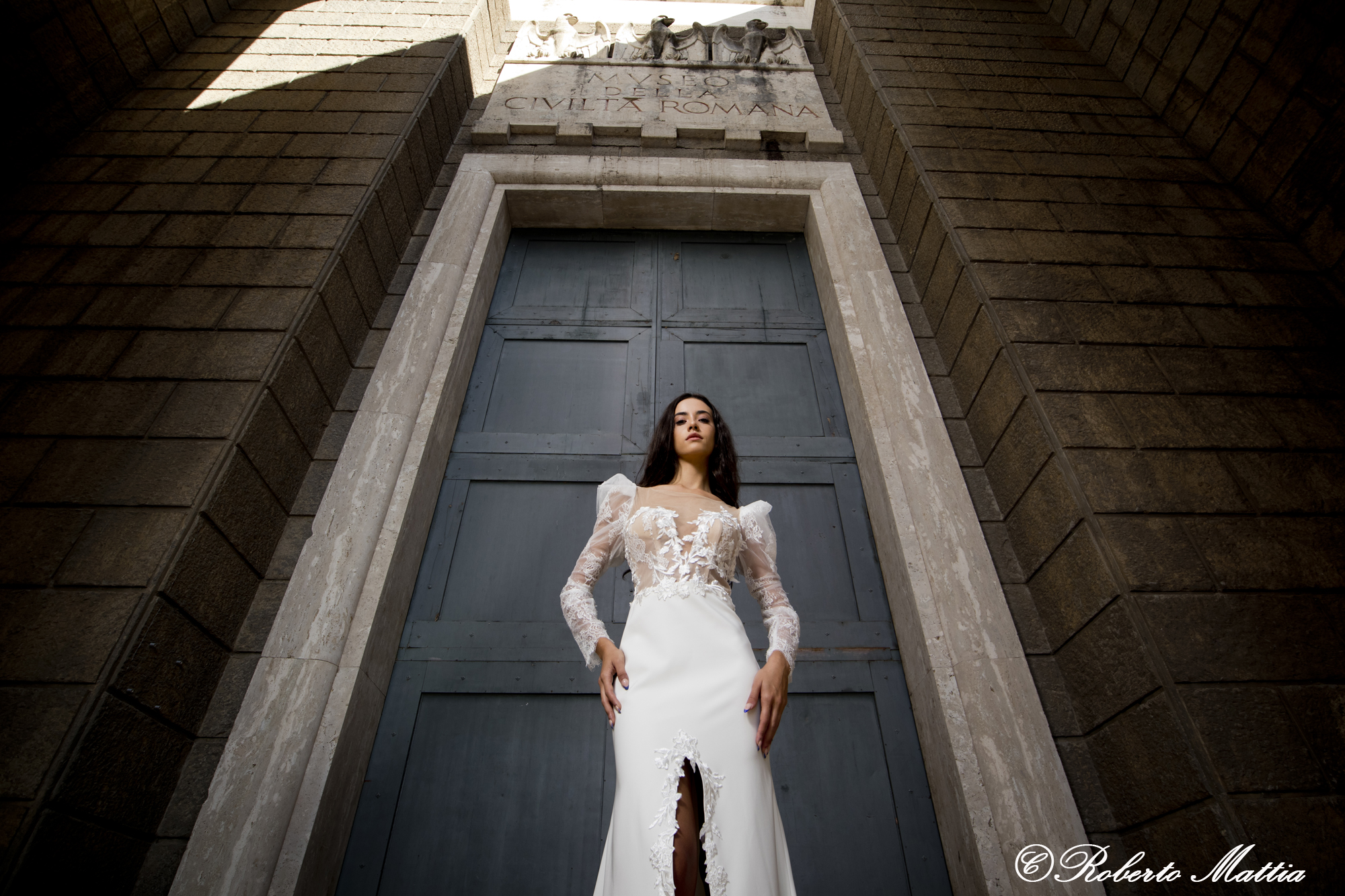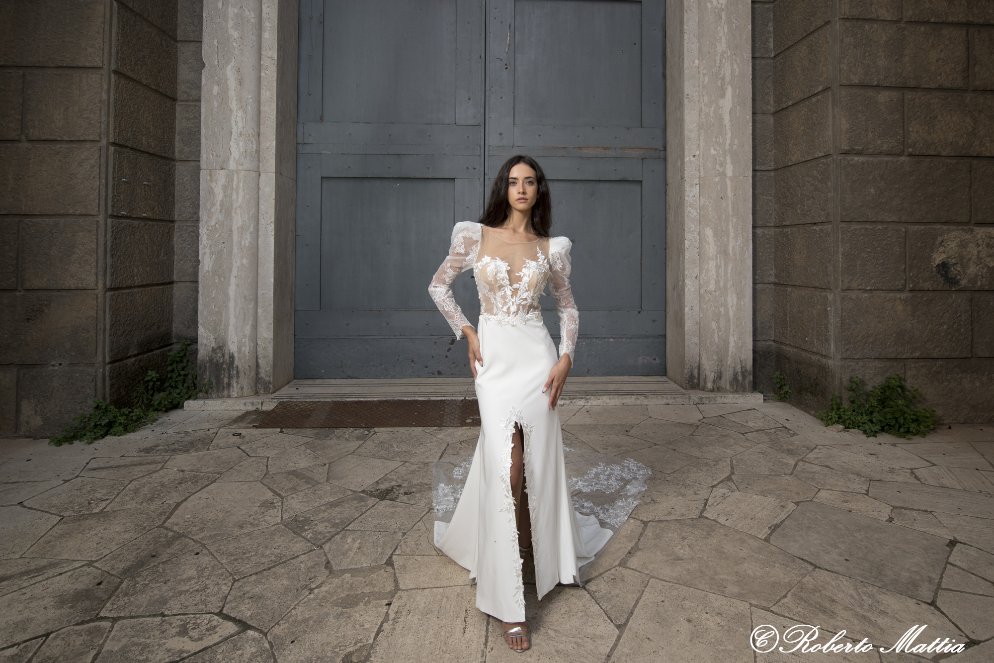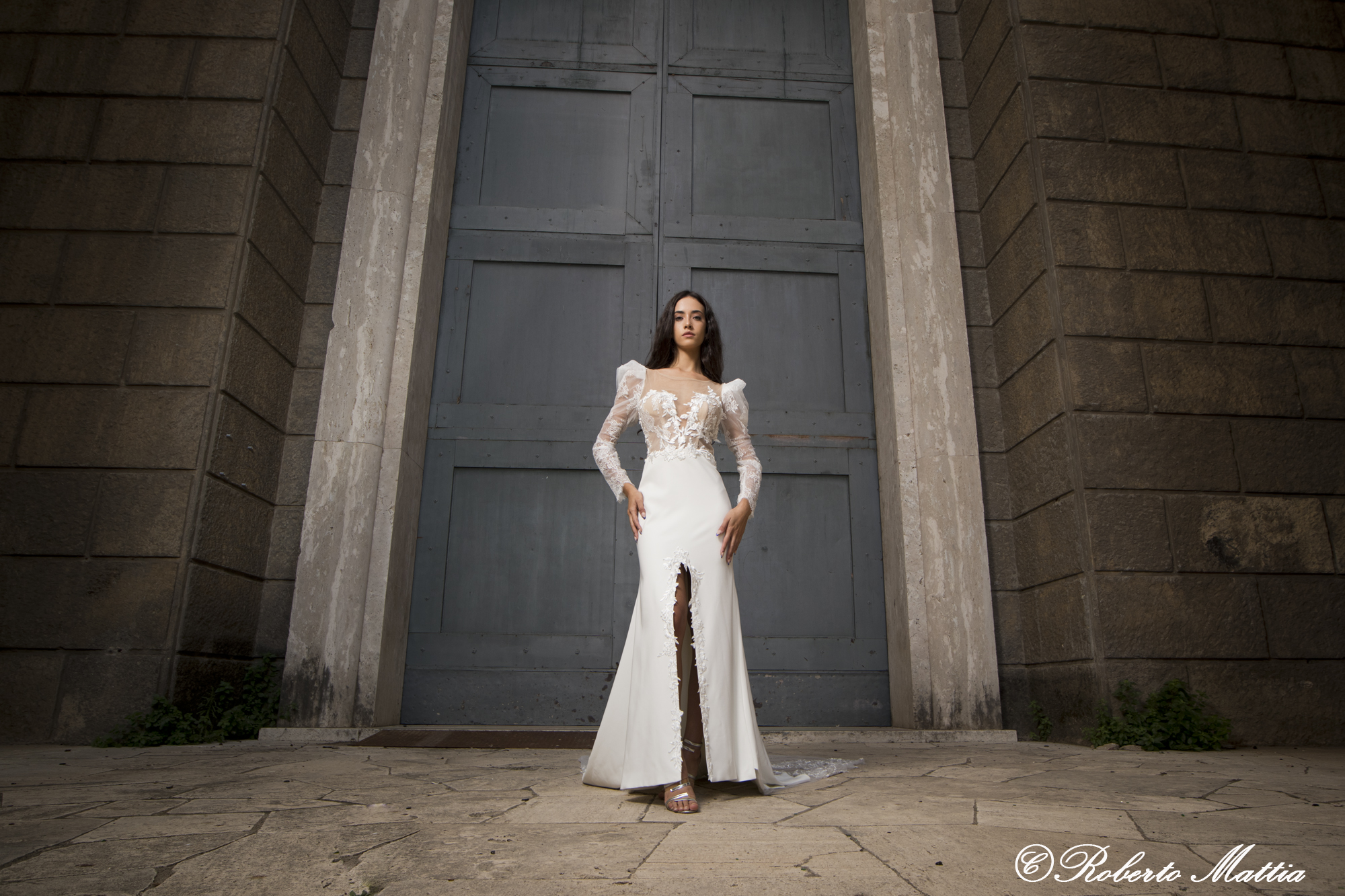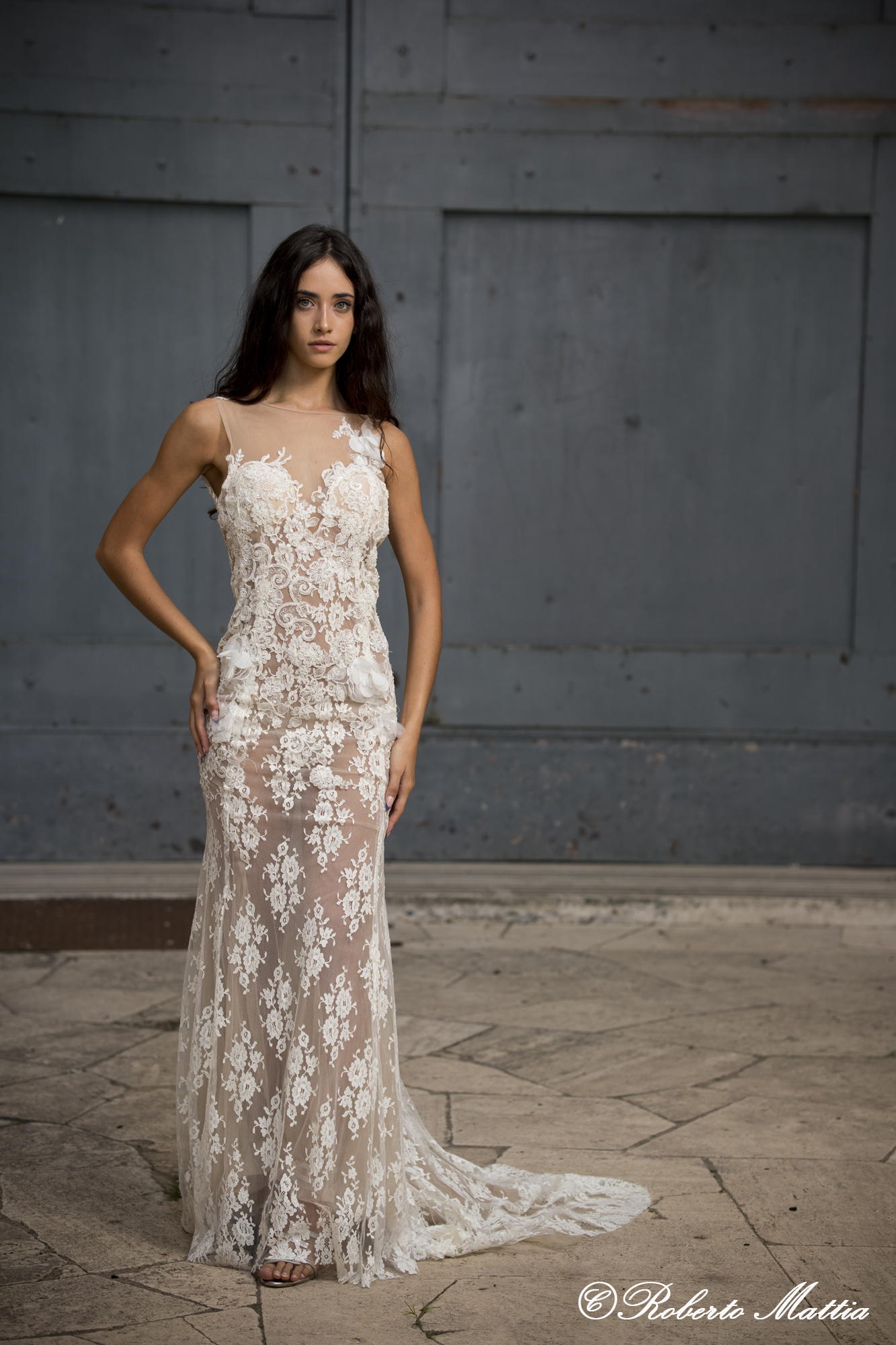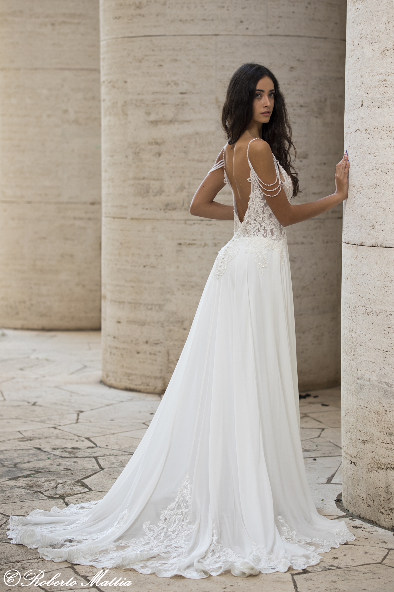 Abito in chiffon con spacco e corpino in pizzo francese con cristalli
