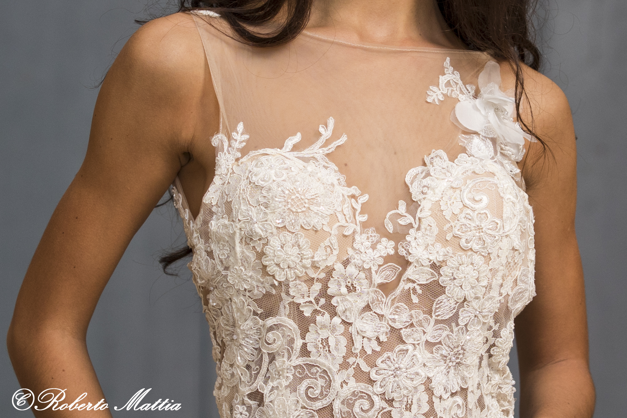 Abito Trasformabile in stile sirena in pizzo nude con sopragonna in tulle ricamata staccabile