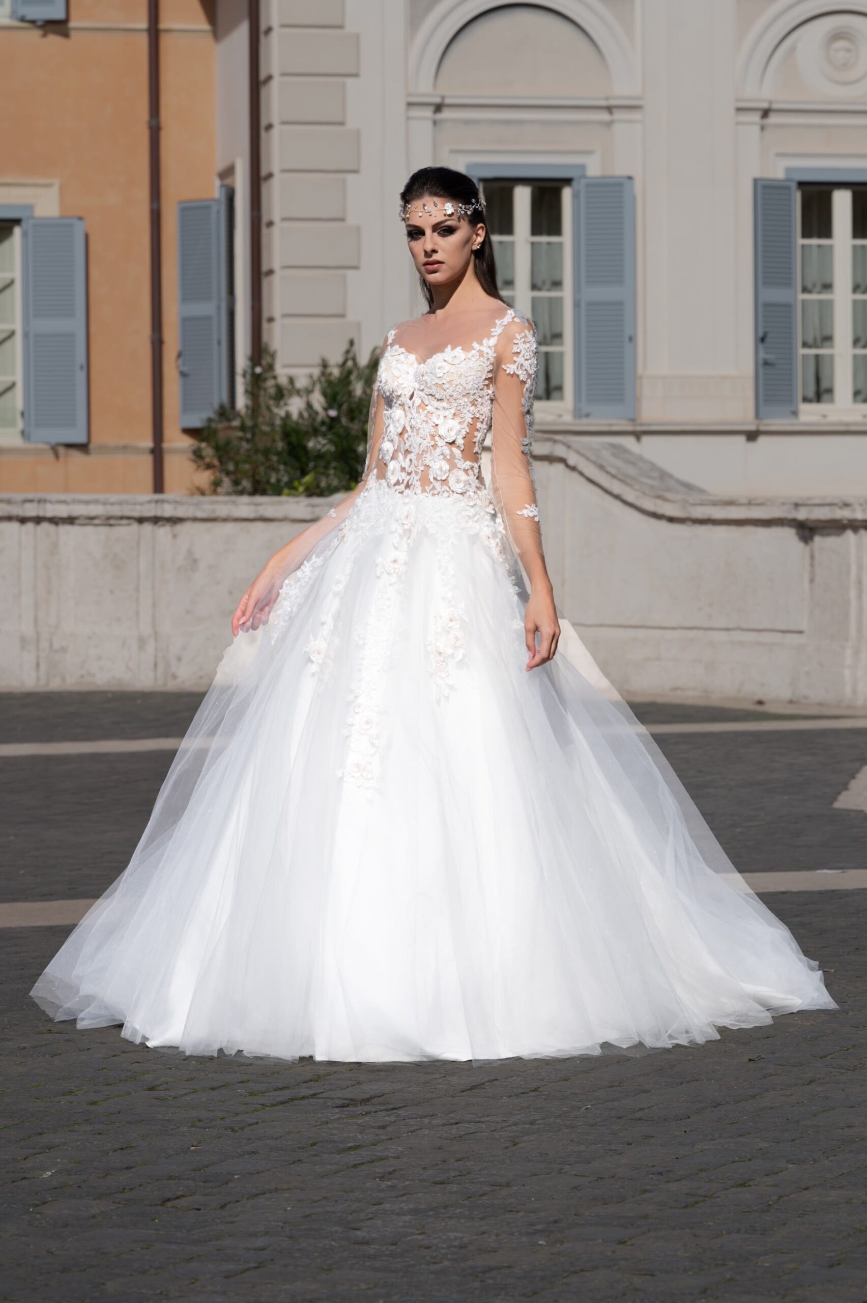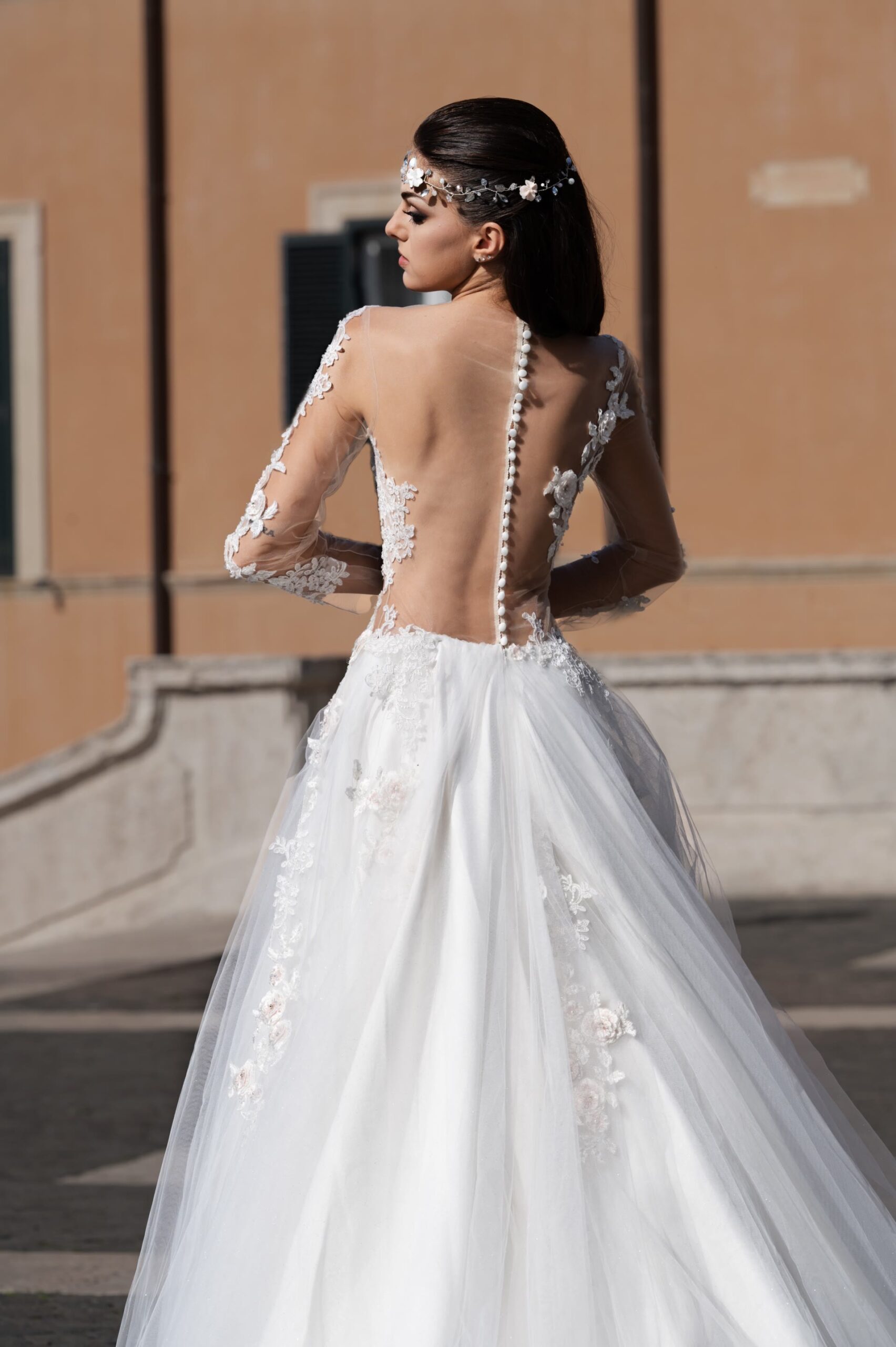 Abito Trasformabile in stile sirena in pizzo nude con sopragonna in tulle ricamata staccabile
