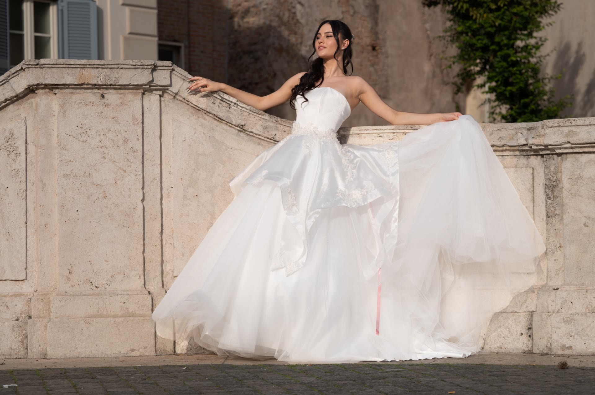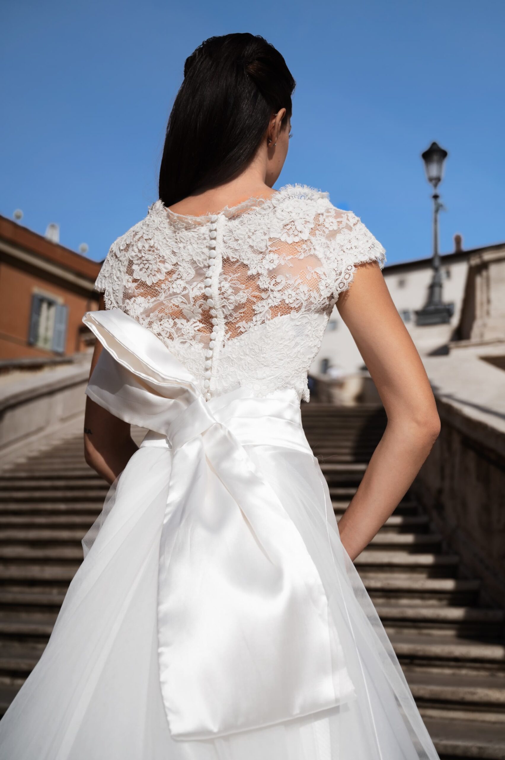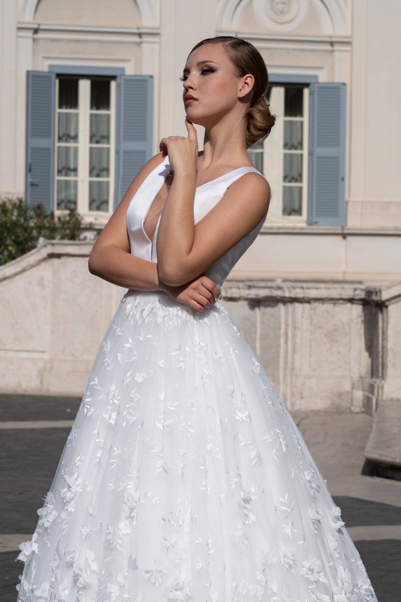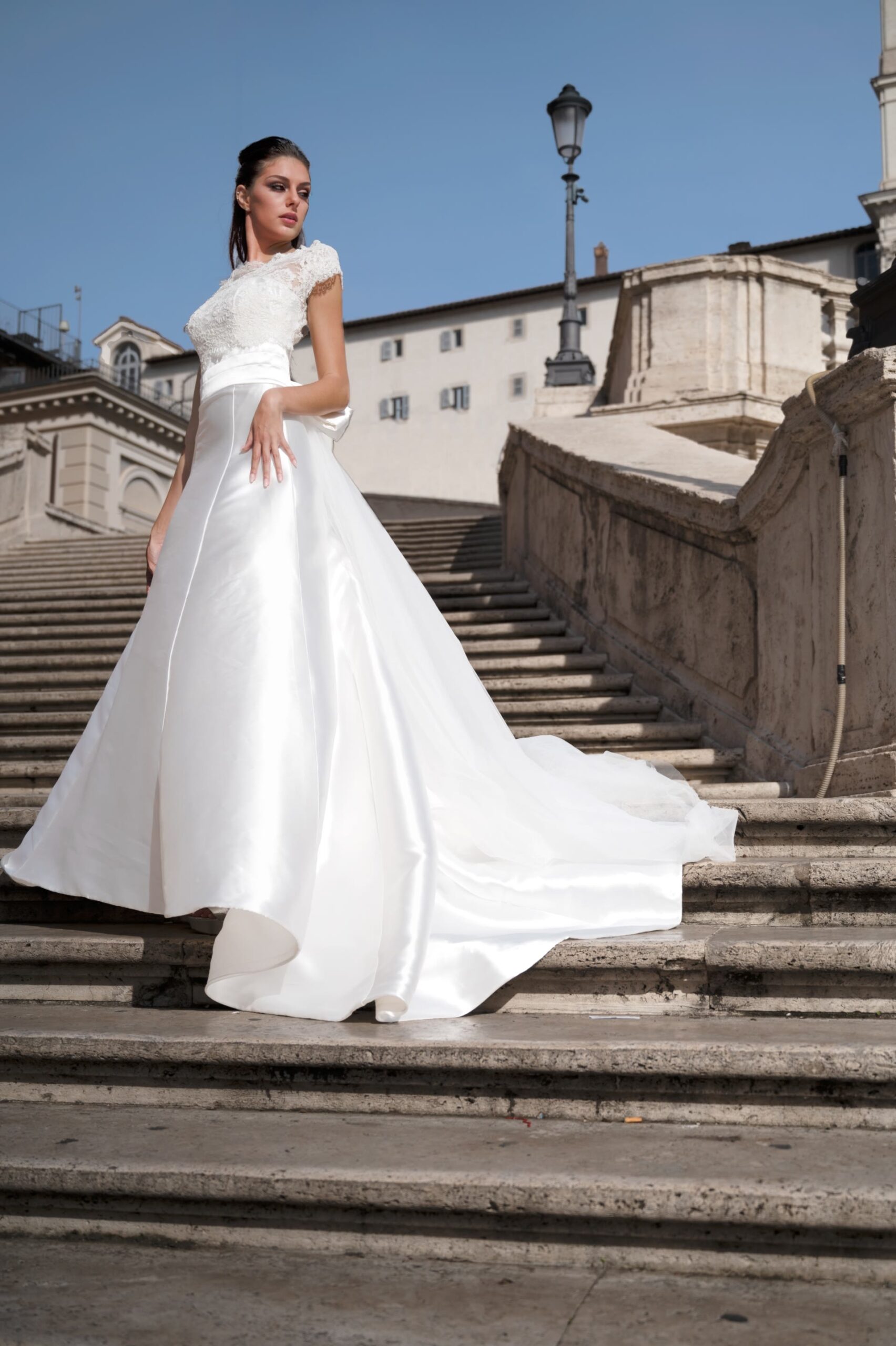 Abito in chiffon con spacco e corpino in pizzo francese con cristalli